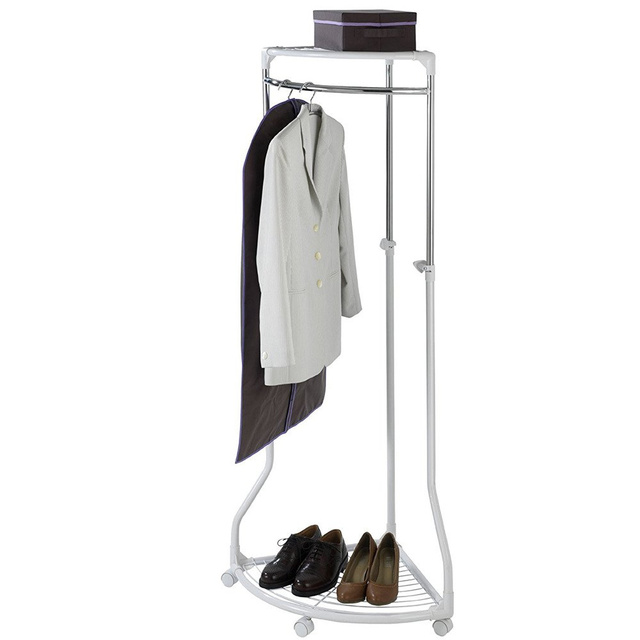Umeraș practic de colț pentru haine. Echipat cu două rafturi de depozitare . Inferioară - perfectă pentru depozitarea pantofilor, partea superioară este perfectă pentru a stivui cutii de carton sau pălării. Conceput pentru depozitarea, uscarea sau aerisirea hainelor - jachete, paltoane, cămăși etc. Va funcționa în orice casă sau birou. Reglabil pe înălțime, vă permite să ajustați cuierul la nevoile dvs. individuale. Nu ocupă mult spațiu. Echipat cu 4 roți, datorită cărora poate fi mutat rapid în orice loc. Două roți sunt echipate cu o frână , care va proteja suportul împotriva schimbărilor nedorite. Manopera solidă. Construcția metalică stabilă și durabilă vă permite să depozitați lucruri de până la 50 kg.