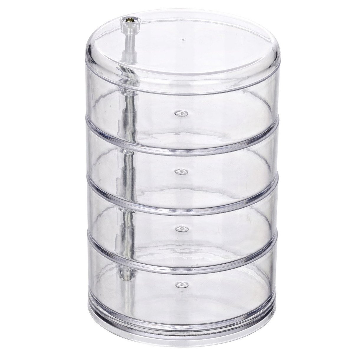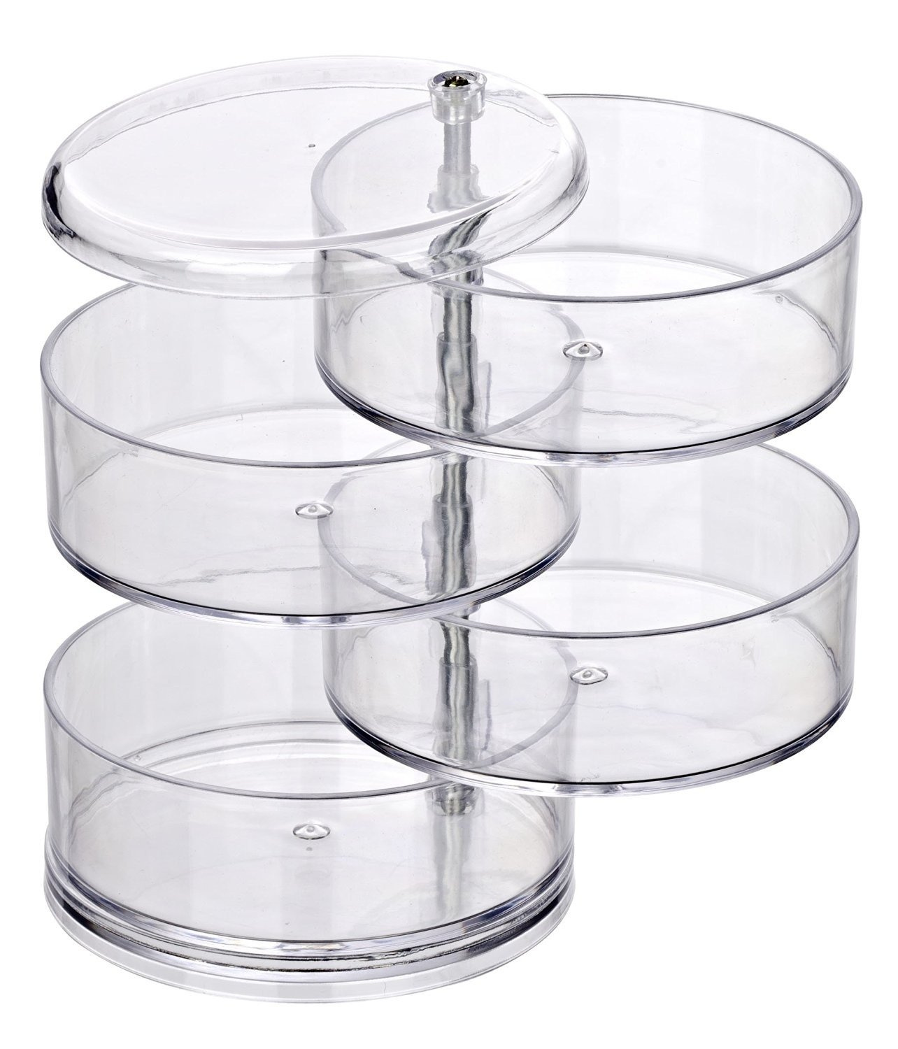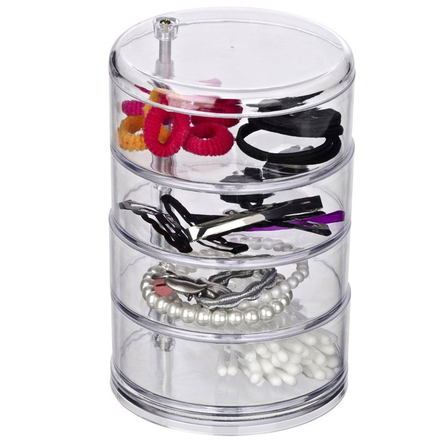 Produsul are compartimente rotunde si este confectionat din plastic. Functioneaza bine pentru a depozita mici produse cosmetice, produse pentru par, lacuri, perii, bijuterii, accesorii de birou, ca agrafe, ace. Fiecare compartiment se poate extinde in orice directie, ceea ce permite un acces convenabil la continut. Culoarea transparenta va ajuta sa determinati rapid continutul.