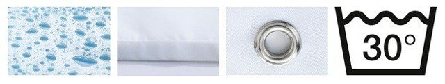 Fabricată din textil durabil, perdeaua de duș va oferi confort în timpul dușului și vă va proteja baia de stropi. Va ajuta la menținerea băii în condiții de igienă. Perdeaua este lavabilă până la 30 ° C . Destinata utilizării cu căzi și cădițe de duș.