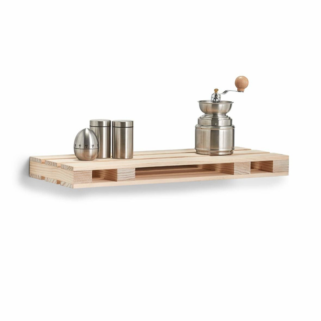 Tema originală palet de transport asigură că raftul se va potrivi perfect atât cu decorul deschis, cât și cu cel întunecat. Designul elegant garanteaza ca raftul decorativ este o solutie extrem de ergonomica, intrucat ocupa foarte putin spatiu si in acelasi timp este extrem de incapator. Poate găzdui accesorii precum o râșniță de cafea, condimente, un vas de zahăr sau un cronometru. Designul atemporal va adăuga farmec atât decorului deschis, cât și întunecat. Întregul este realizat din lemn de pin de înaltă calitate care garantează satisfacția utilizării.