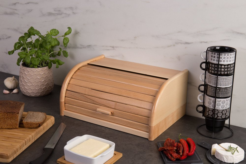 Cutie de paine fabricata din lemn de fag rezistent, va proteja eficient continutul impotriva pierderii prospetimii si va preveni dezvoltarea mucegaiului. Datorita ei, painea ta va fi intotdeauna crocanta si gustoasa . In plus, designul estetic si forma longitudinala se amesteca frumos in interior intr-un stil modern si ecologic. Deschiderea convenabila a capacului in sus permite accesul rapid si usor spre interior.