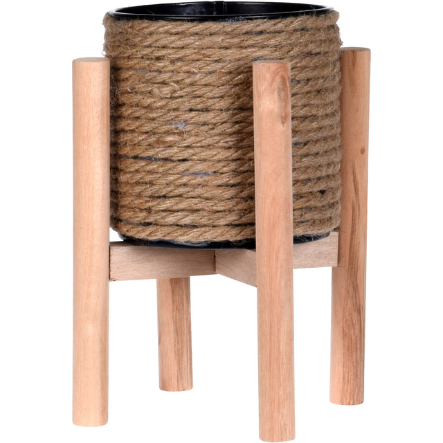 Este un accesoriu care va plăcea în special iubitorilor stilului scandinav și boho, datorită minunatului său suport împletit din sfoară de iută și picioarelor simple din lemn. Ghiveciul se va potrivi în special pentru decorarea salonului și a dormitorului. Cel mai bine este să-l așezi într-un colț al camerei sau lângă fereastră. Ghiveciul este realizat din metal negru (interior), iută maro (suport) și lemn de culoare maro deschis (suport).