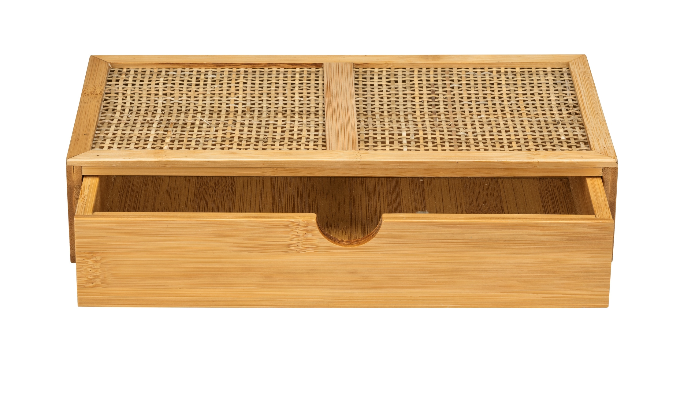- Cutie din bambus: Organizerul este realizat din lemn de bambus și decorațiuni din ratan. Datorită utilizării bambusului, sertarul se va descurca perfect în baie umedă.