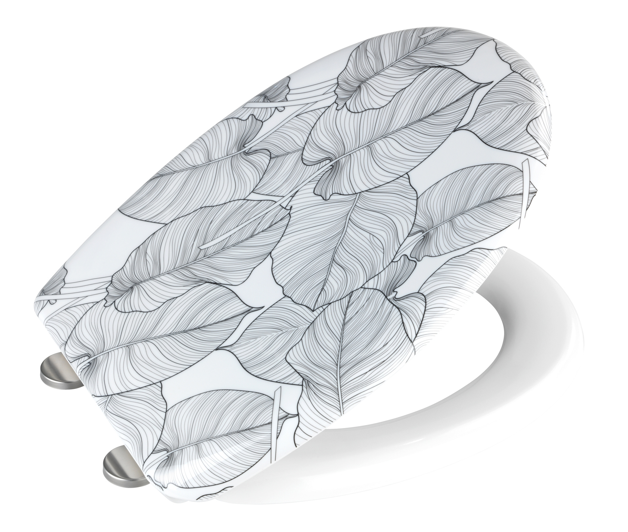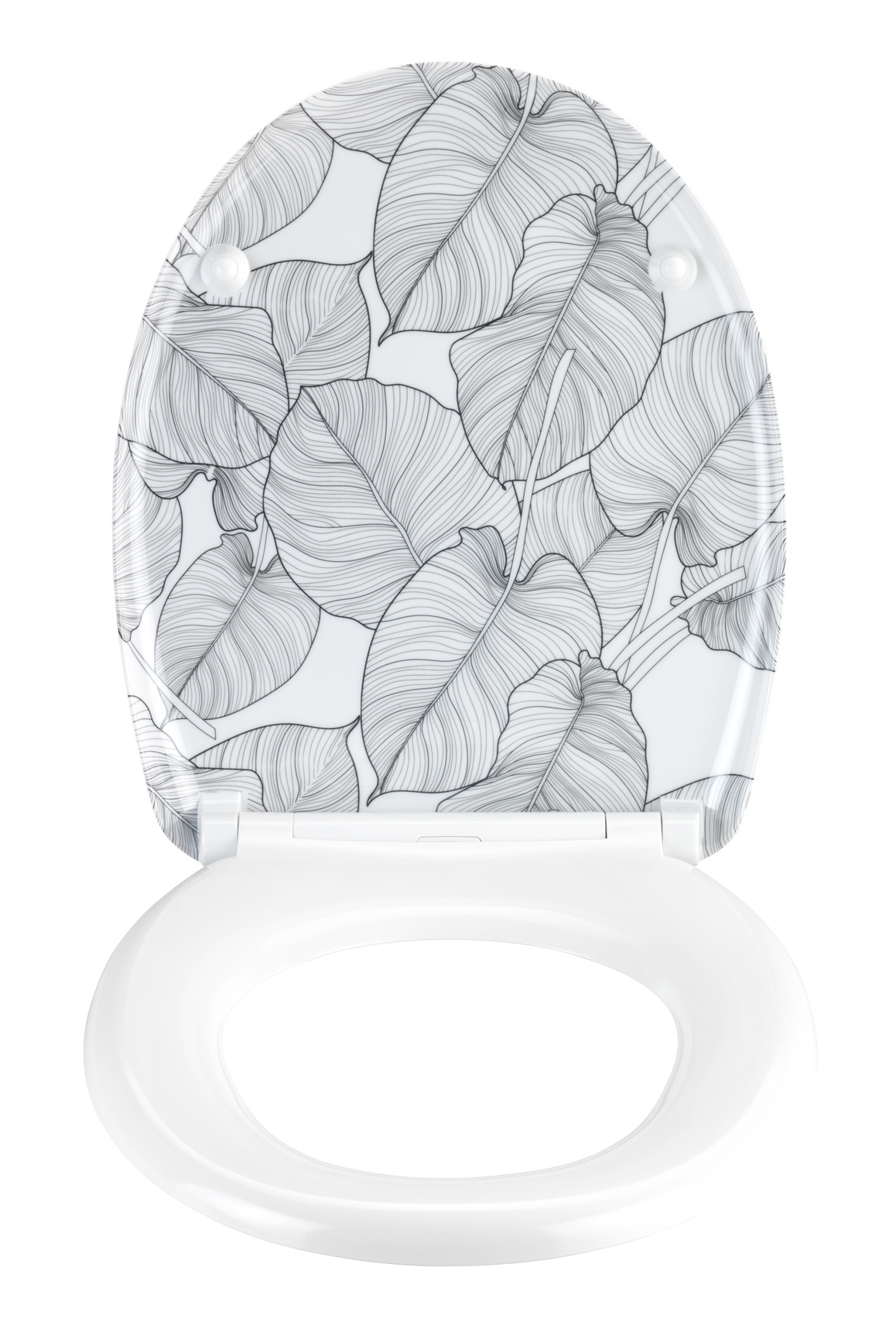 - Imprimeu stilat: Imprimeul decorativ cu frunze adaugă caracter fiecărei băi, aducând un strop de natură în interior. Datorită acestui fapt, capacul devine nu doar un element funcțional, ci și o decorațiune.