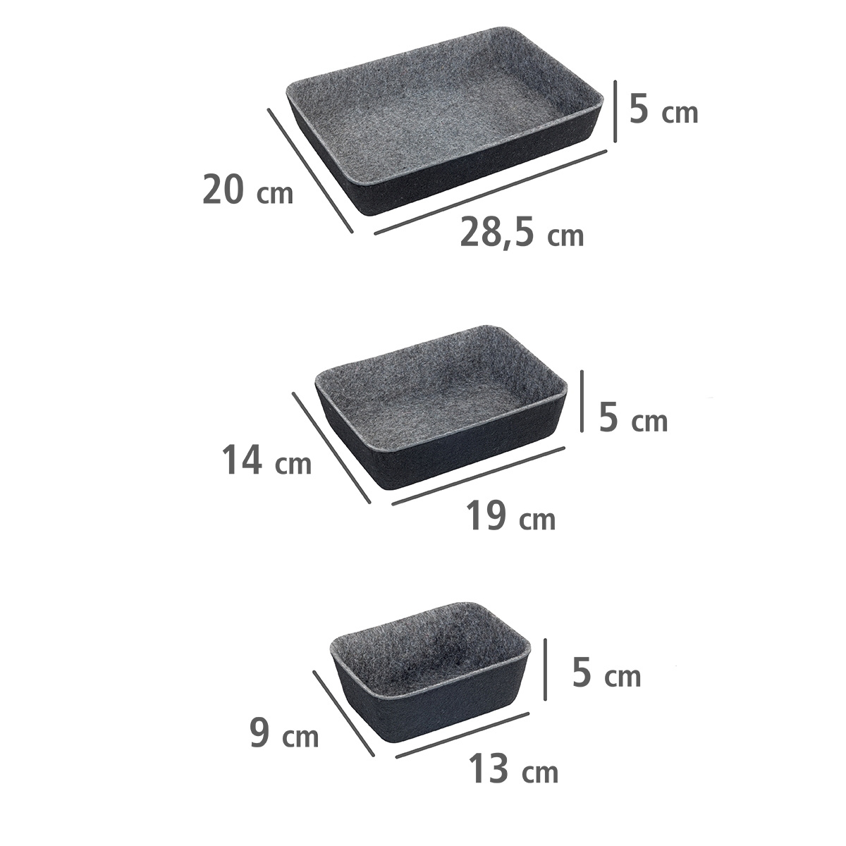 - 7 bucăți . Setul este format din 7 organizatori in trei dimensiuni. Dimensiunile individuale sunt: 20 x 28,5 cm (1x), 19 x 14 cm (2x), 13 x 9 cm (4x). Organizatoarele au 5 cm înălțime. & Nbsp;