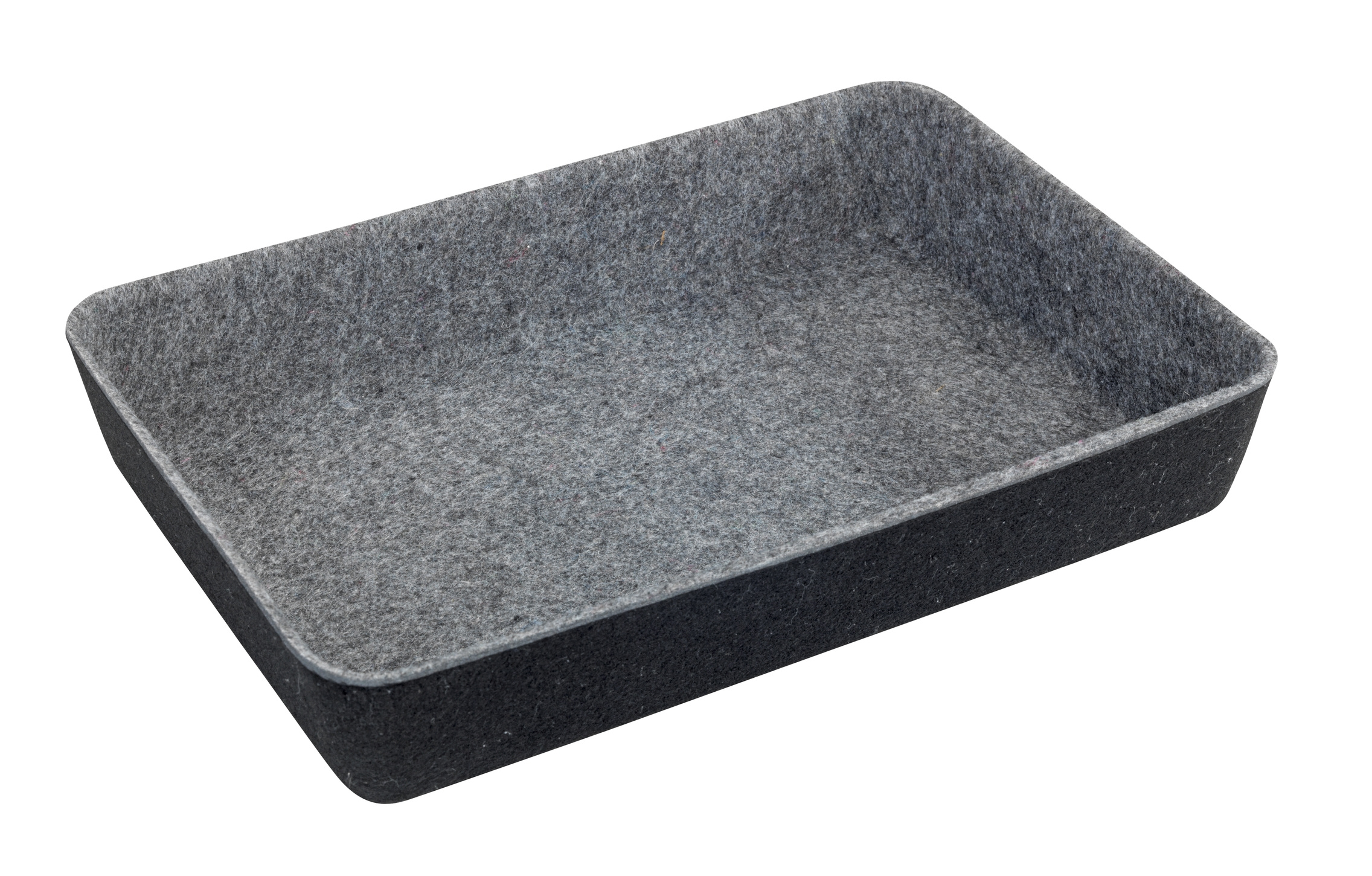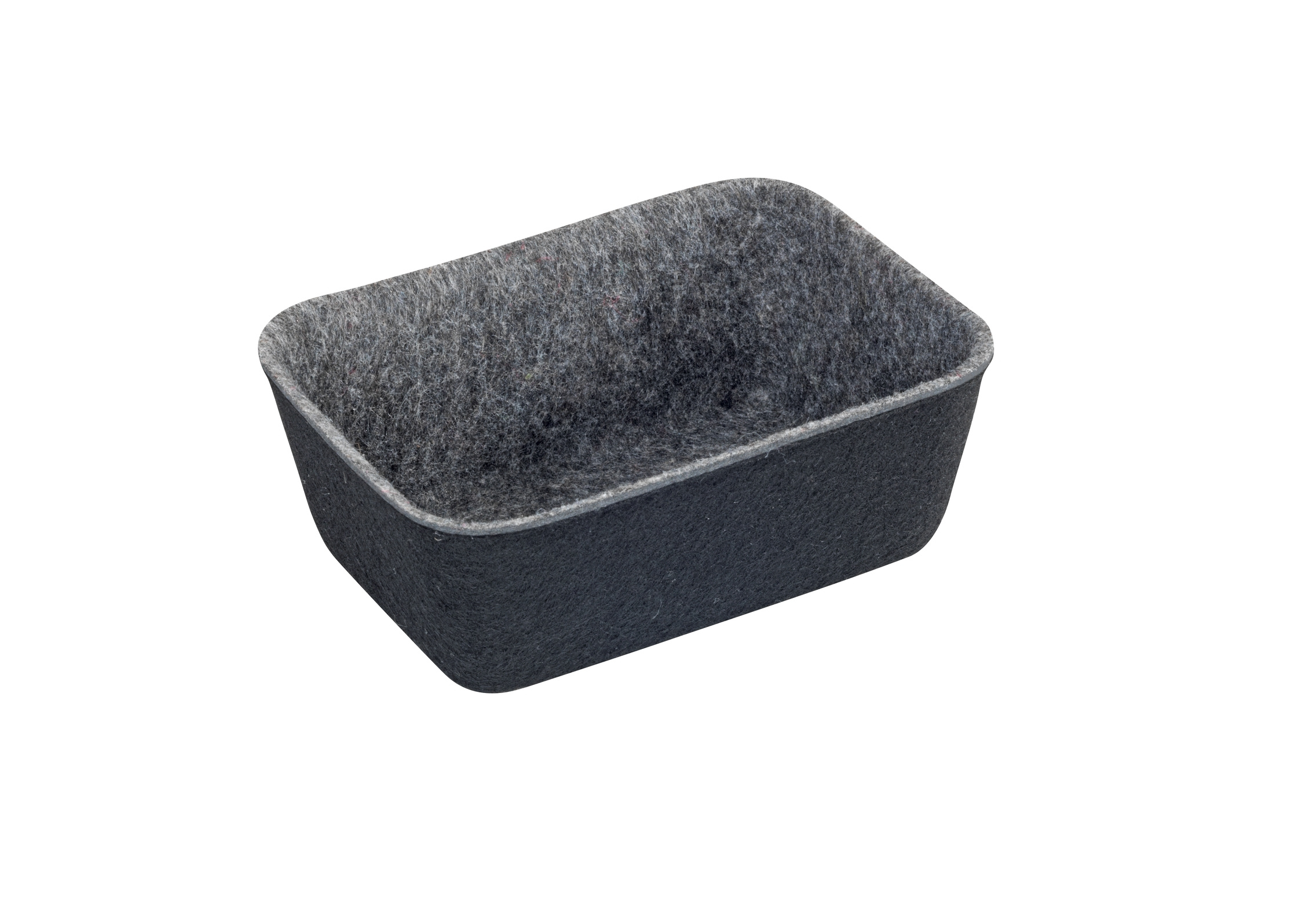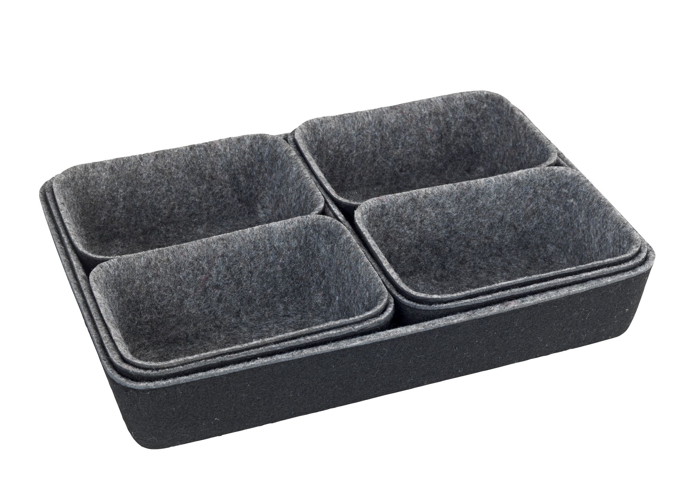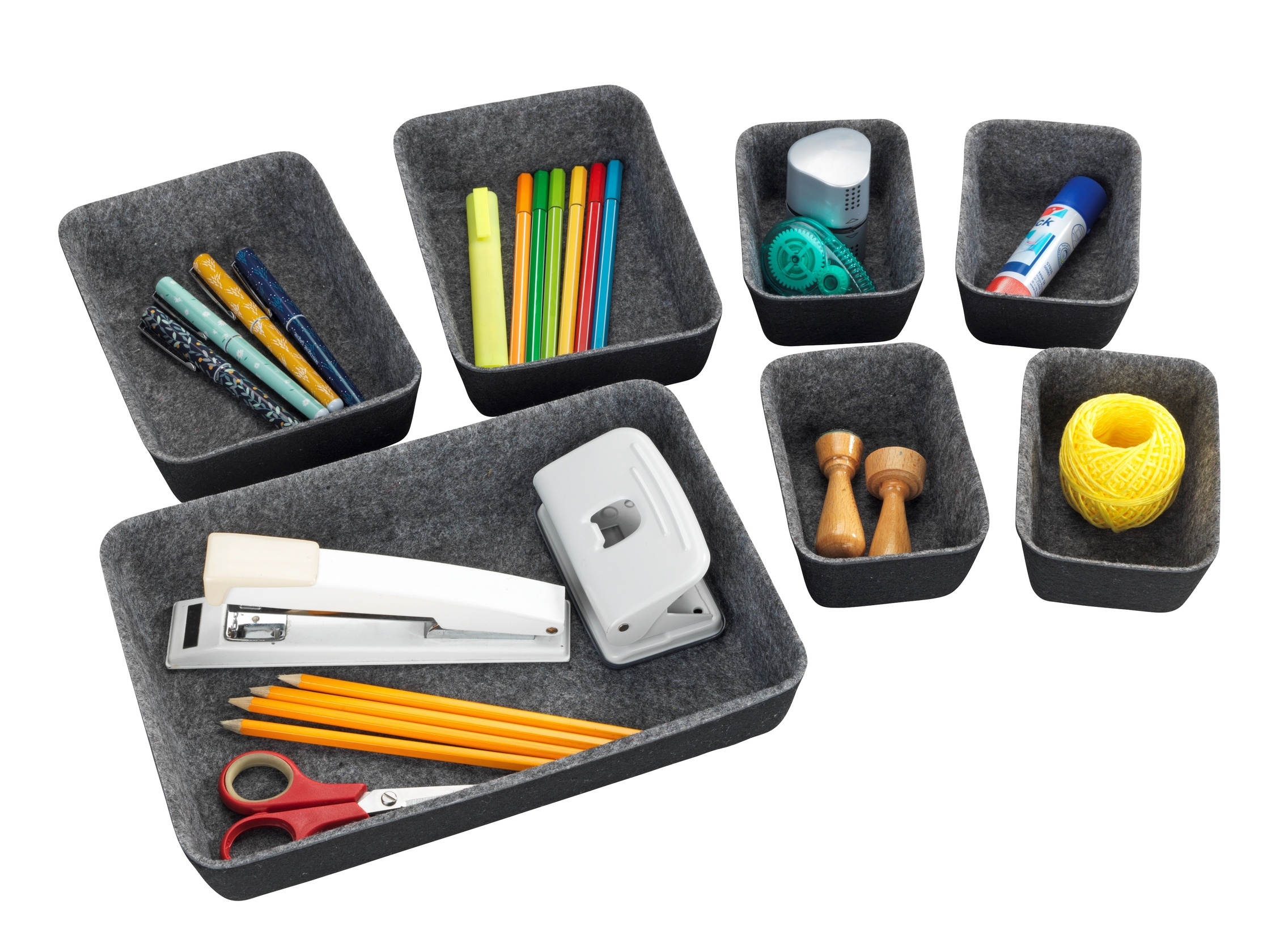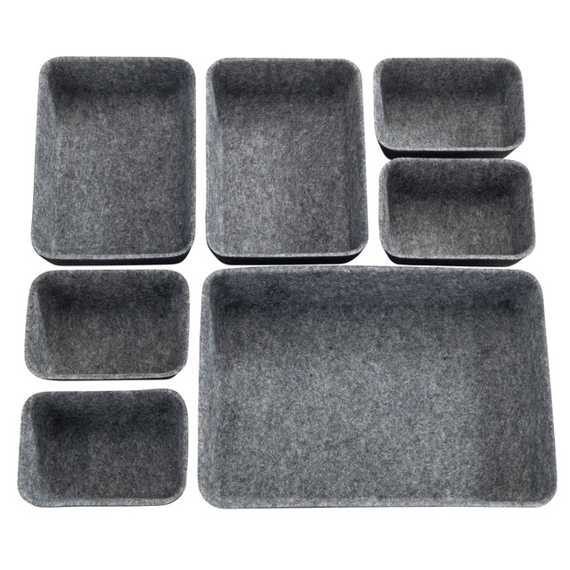 - Recipiente din pâslă . Organizatoarele de sertare sunt realizate din fetru. Materialul pentru producerea sa a fost poliester reciclat. Pâsla nu va zgâria sertarul dacă alunecă în interior.