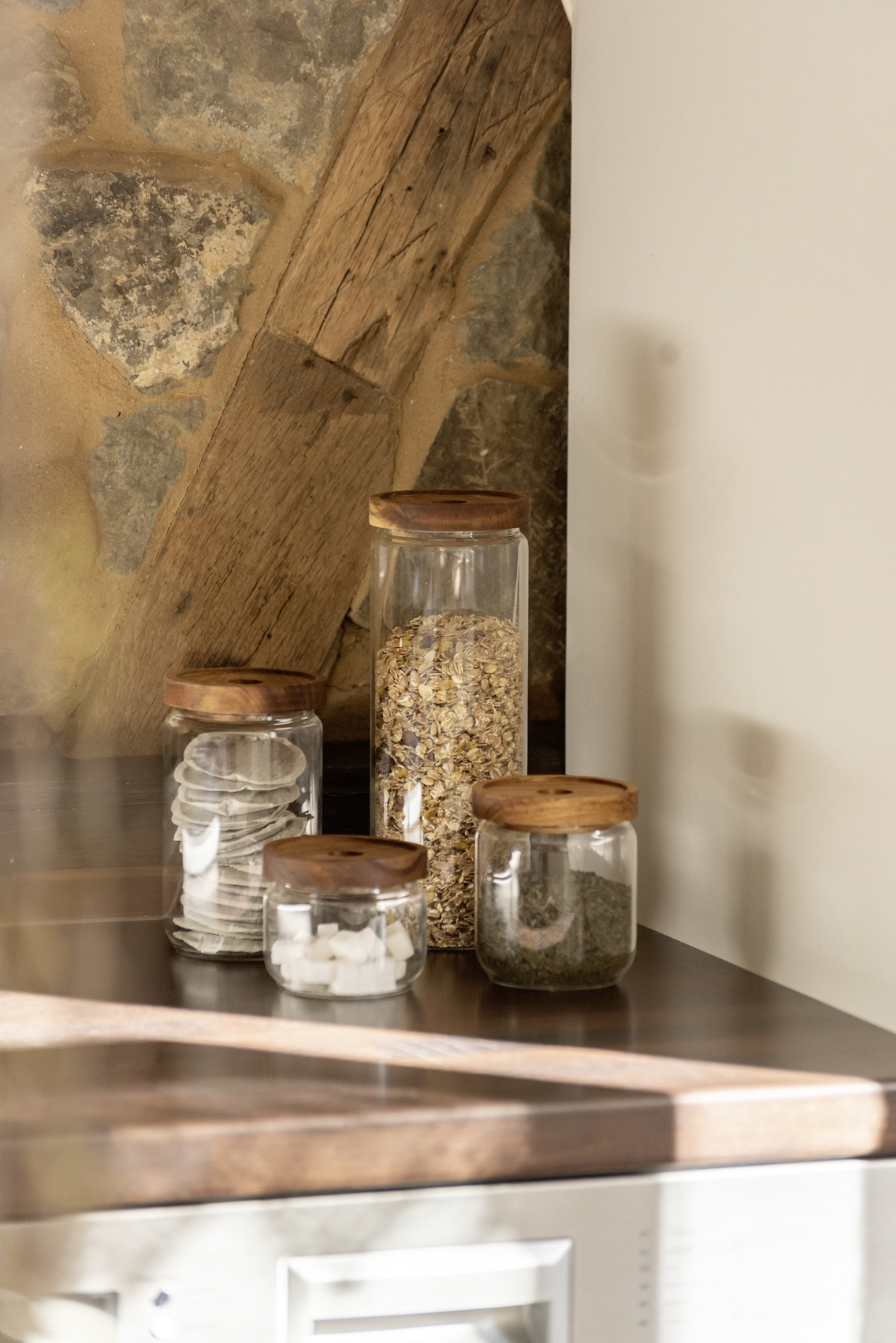 .- Ermetic: O formă alungită din sticlă, acoperită cu un capac din lemn de salcâm. Acesta este motivul pentru care designerii au optat pentru o armătură din silicon. Aceasta împiedică scurgerea aromelor. Protejează produsele din interior de umiditate și insecte.