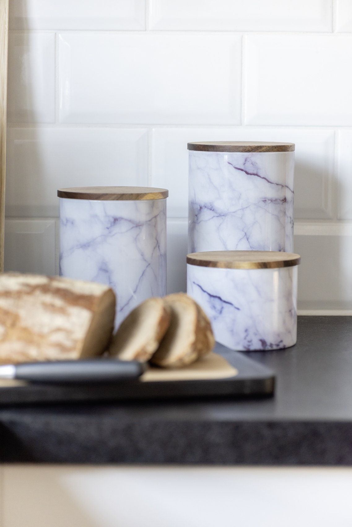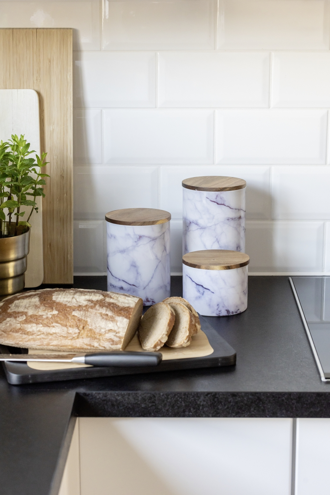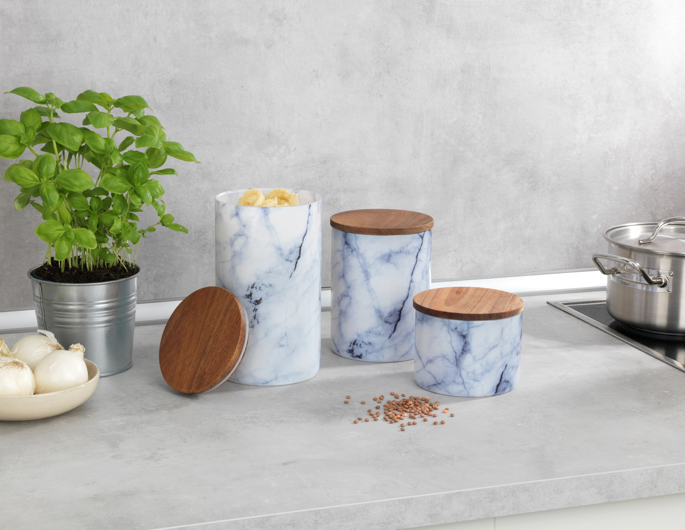 Recipient pentru depozitarea alimentelor vrac MIO cu design unic & ndash; un recipient cu model de marmură și un capac din lemn