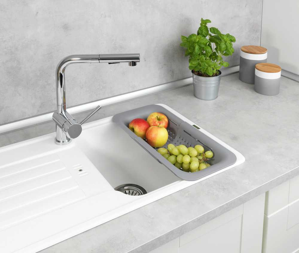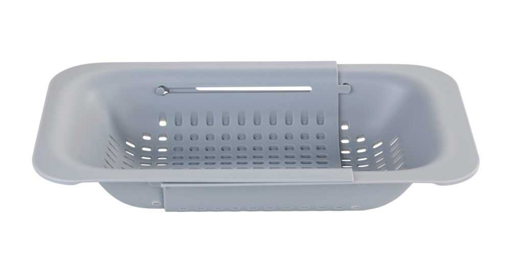 - Instalare simplă . Scurgătorul este suficient pentru a-l pune pe chiuvetă & ndash; construcția sa rămâne ferm și stabil pe marginile chiuvetei. După terminare, este o idee bună să-l glisați în jos pentru a ocupa mai puțin spațiu.