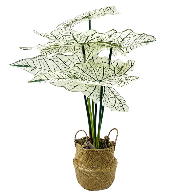 Un mare avantaj al Alocasia artificială este aspectul său minunat pe tot parcursul anului, fără a necesita atenția noastră și fără a fi nevoie să asigurăm condiții adecvate. Nici măcar vremea de afară nu le afectează! Indiferent dacă plouă sau este caniculă: planta artificială stă neclintită, bucurând privirile. Datorită materialelor utilizate, arată foarte natural, imitând perfect aspectul frunzelor verzi largi de alocasia. Un alt avantaj este coșul împletit din iarbă marină în care este plasată planta. Datorită acestui lucru, totul se potrivește foarte bine, iar decorarea este gata să fie așezată pe un blat, raft sau pervaz.