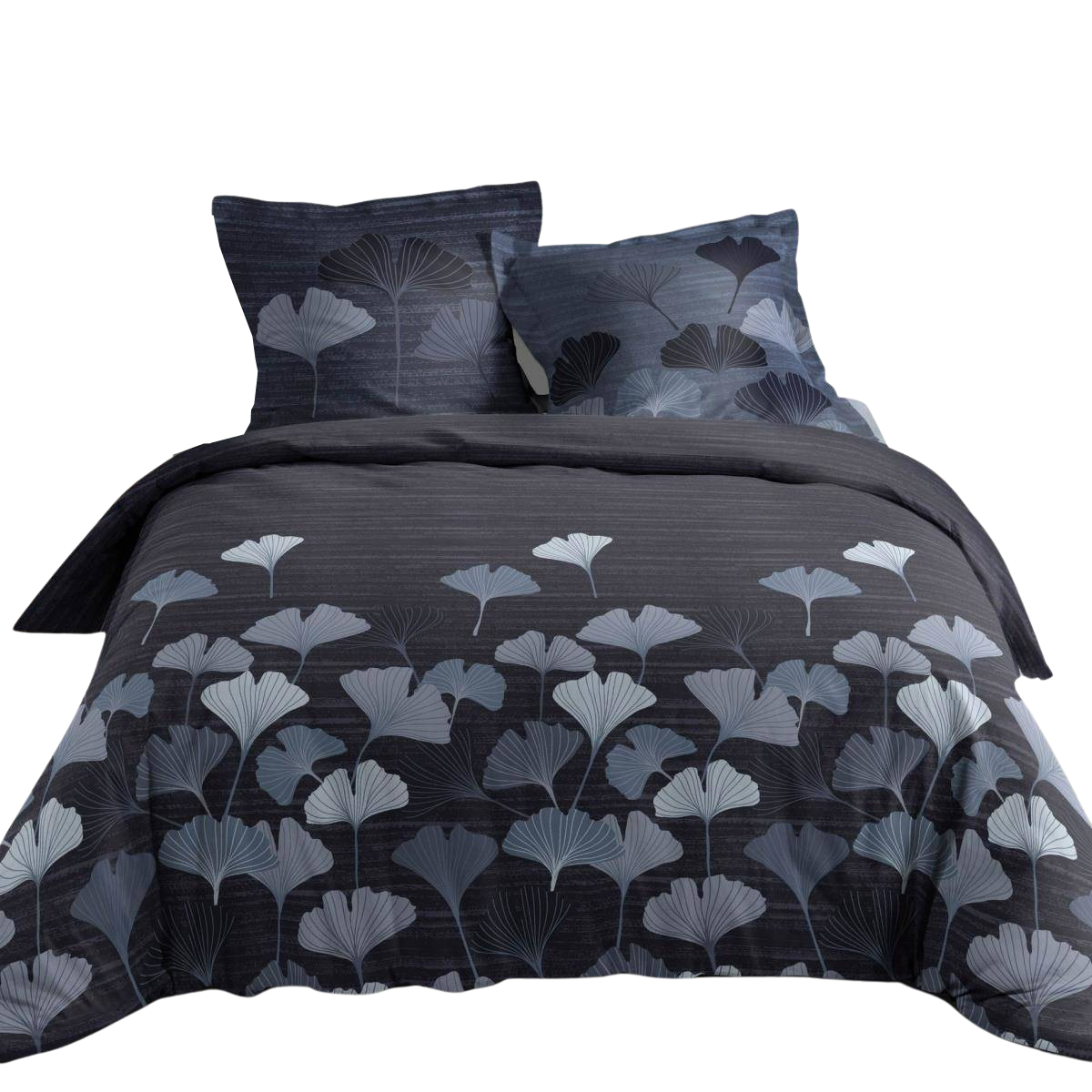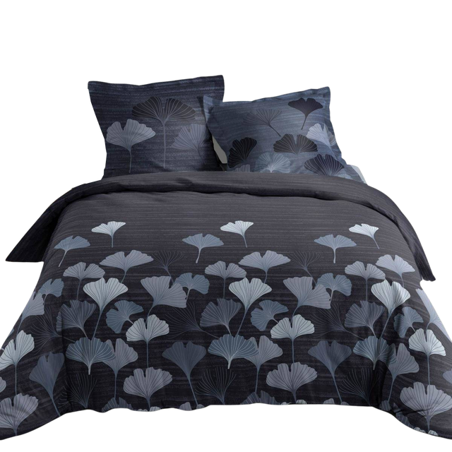 - Model floristic: Lenjeria de pat de culoare închisă este îmbogățită cu o model original de copac ginkgo. Ansamblul creează o imagine extrem de elegantă și combinație de designer.
