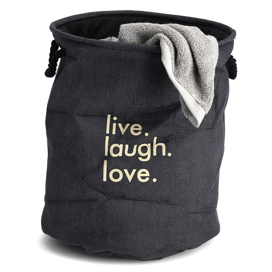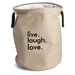 - Două variante de culoare: Coșul pentru rufe prezentat este disponibil în două variante de culoare – albastru închis și culoarea naturală a jutei. Alege culoarea care va completa decorul băii tale. Pe coș se află un mesaj optimist în limba engleză.