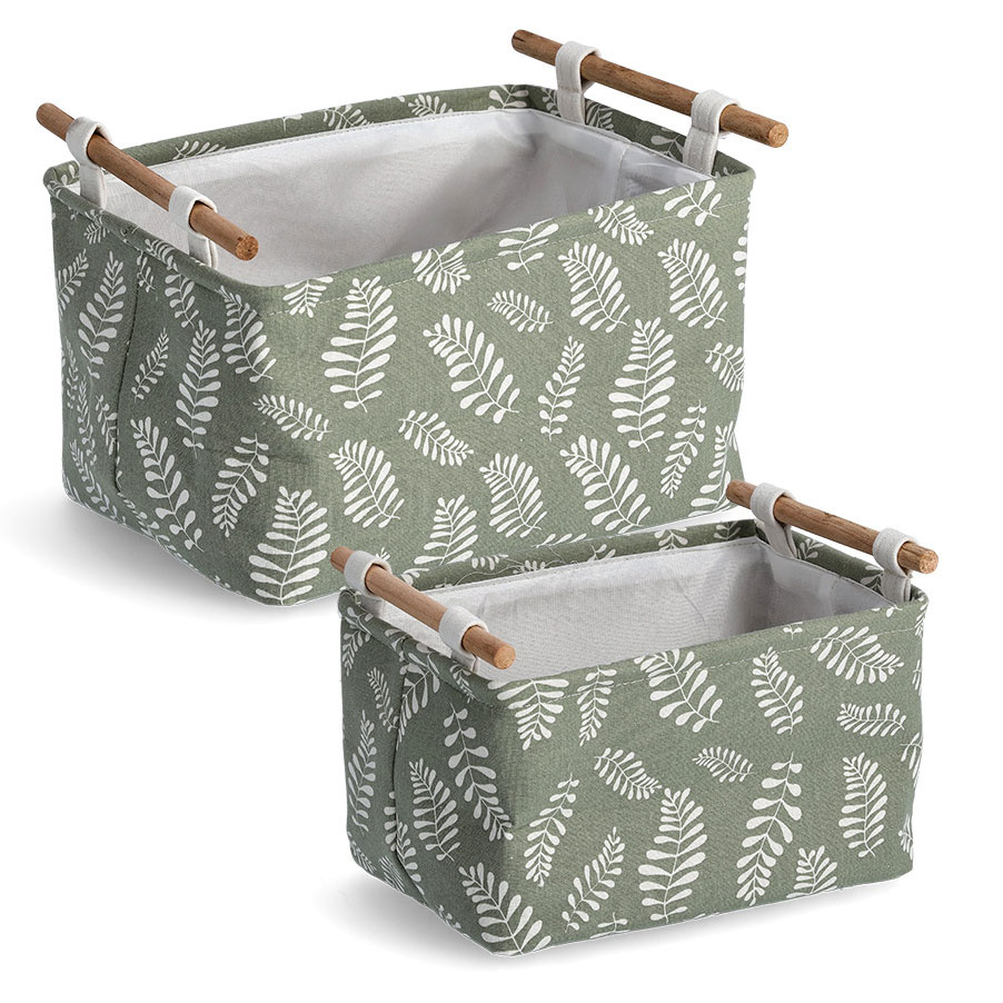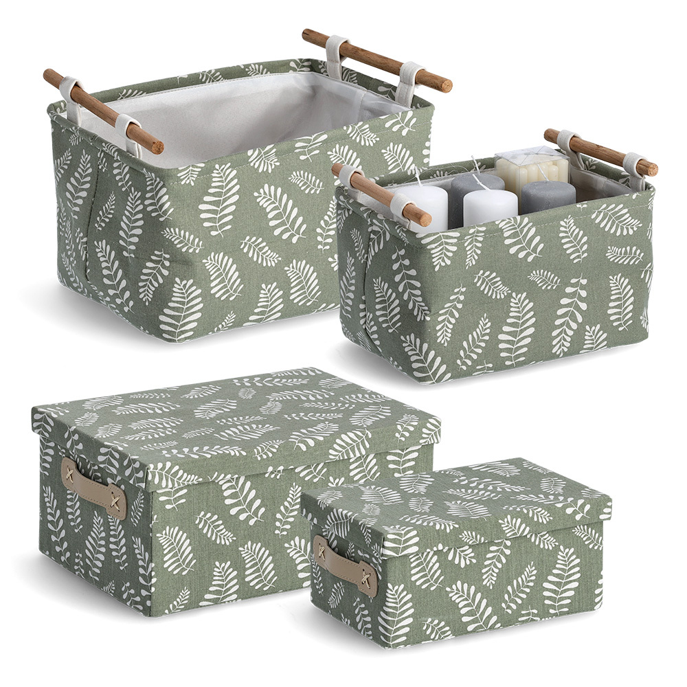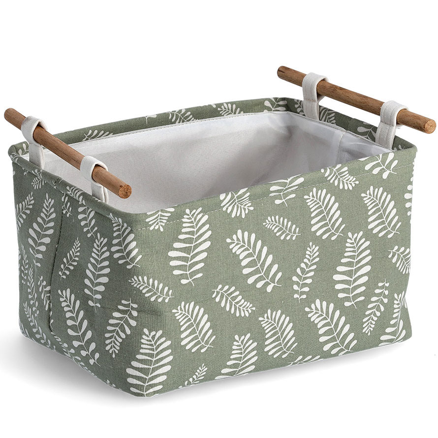 - Motiv de frunze: Containerul de depozitare din bumbac este acoperit pe exterior cu un material verde cu un motiv floral alb. Interiorul cutiei este alb. Întregul aspect este completat de mânerele din bambus, păstrând culoarea naturală a lemnului.