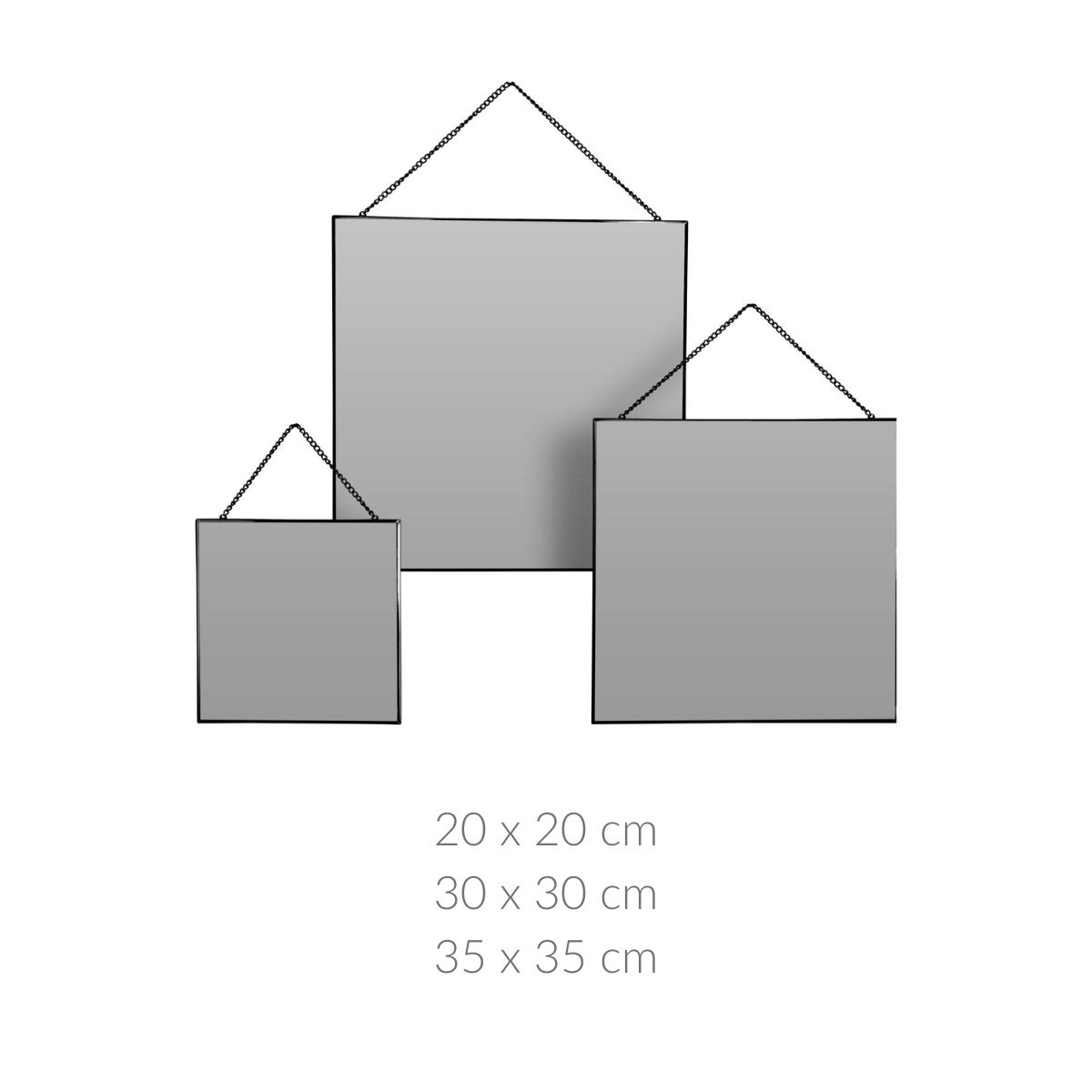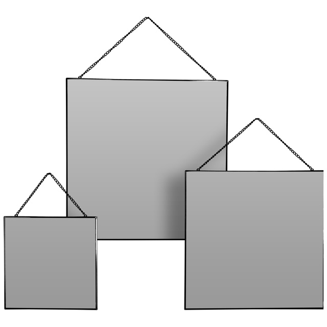 Set de trei oglinzi pe lant de diferite marimi. Design elegant: Setul este format din trei oglinzi in forma patrata, cu rama si lant negru, care le confera un aspect elegant si modern. Dimensiuni diferite: Oglinzile sunt disponibile in trei dimensiuni - mici (20x20 cm), medii (30x30 cm) si mari (35x35 cm), ceea ce le permite sa fie adaptate la diferite spatii si stiluri interioare. Multifuncțional: Oglinzile pot fi prezentate individual sau împreună, ceea ce vă permite să creați diverse combinații și aranjamente în funcție de preferințele utilizatorului. Lanțuri de agățat: Fiecare oglindă este echipată cu un lanț, ceea ce facilitează agățarea acesteia pe perete. Este o soluție practică care economisește spațiu. Construcție robustă: Oglinzile sunt plasate într-un cadru negru, care oferă stabilitate și durabilitate, permițând utilizarea pe termen lung.