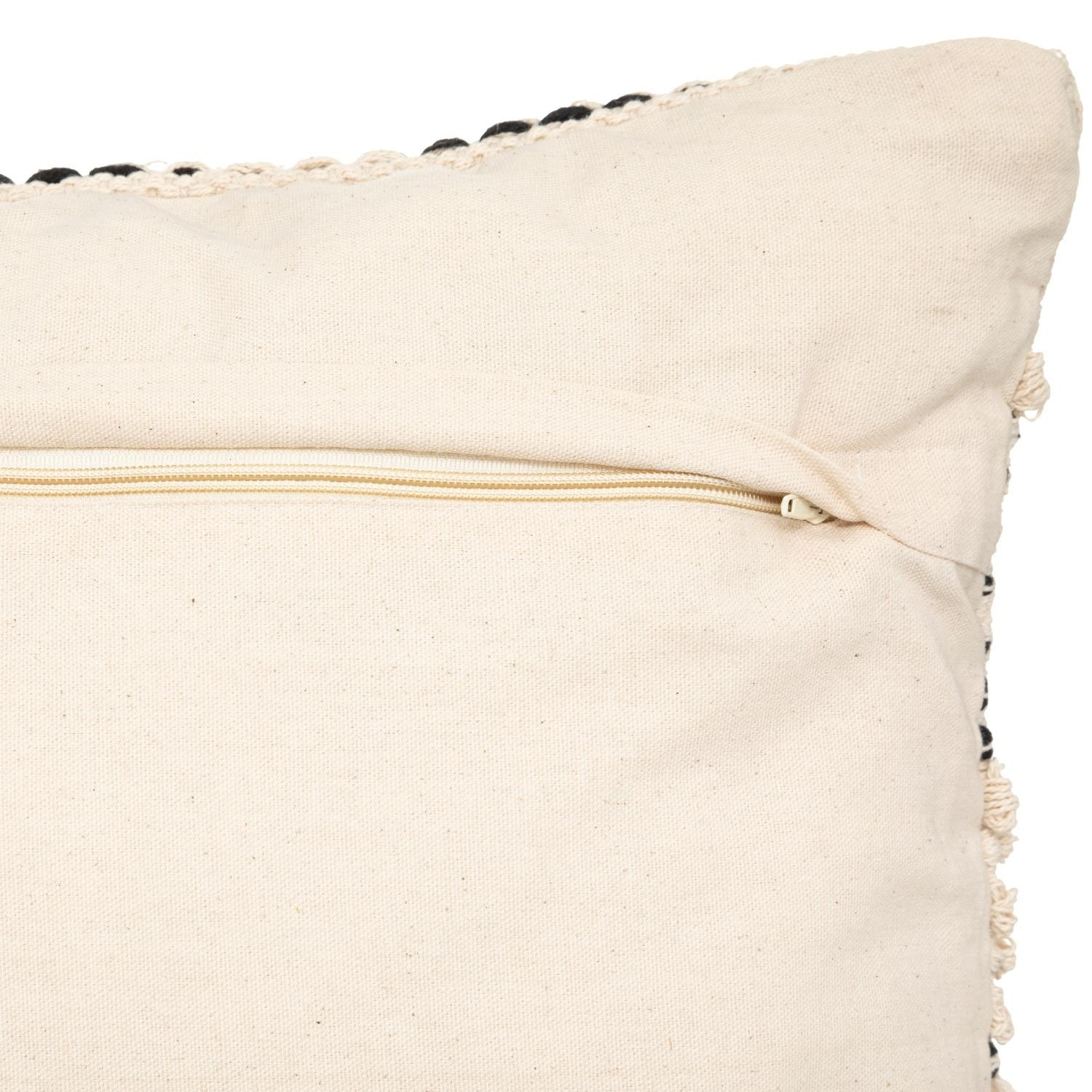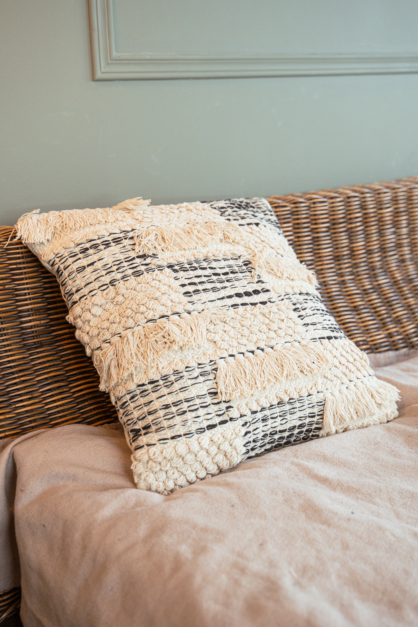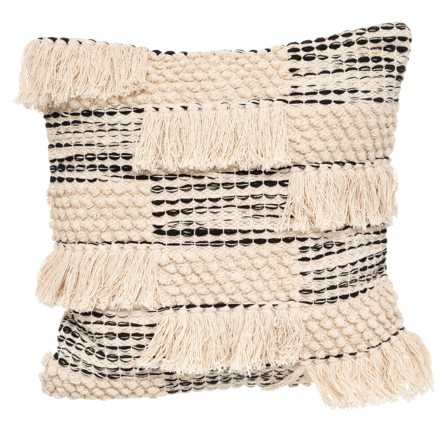 Perna decorativa cu ciucuri, fata de perna din bumbac, 45 x 45 cm. Fata de perna cu franjuri: Din bumbac, perna se remarca prin franjuri delicate care ii confera un caracter unic. Culoarea sa bej și modelele negre delicate adaugă eleganță și stil interiorului. Dimensiuni optime: Perna cu dimensiunea de 45 x 45 cm si inaltimea de 15 cm este ideala pentru decorarea sufrageriei sau dormitorului. Dimensiunea sa adecvată oferă suport confortabil și aspect estetic în interiorul dumneavoastră. Ușor de utilizat și întreținut: Fata de pernă este detașabilă și cu fermoar pentru o curățare ușoară și păstrare curată. Umplutura din poliester asigură moliciune și confort în timpul utilizării. Franjuri pentru un efect decorativ: Franjurii nu sunt doar un plus elegant, ci ofera si pernei un aspect unic. Ei creează un accent decorativ frumos în interiorul tău. Utilizare universală: Această pernă se potrivește perfect în diverse stiluri și aranjamente interioare, adăugându-le farmec și confort. Poate fi un accent decorativ pe o canapea, fotoliu sau pat, oferind camerei un caracter unic.