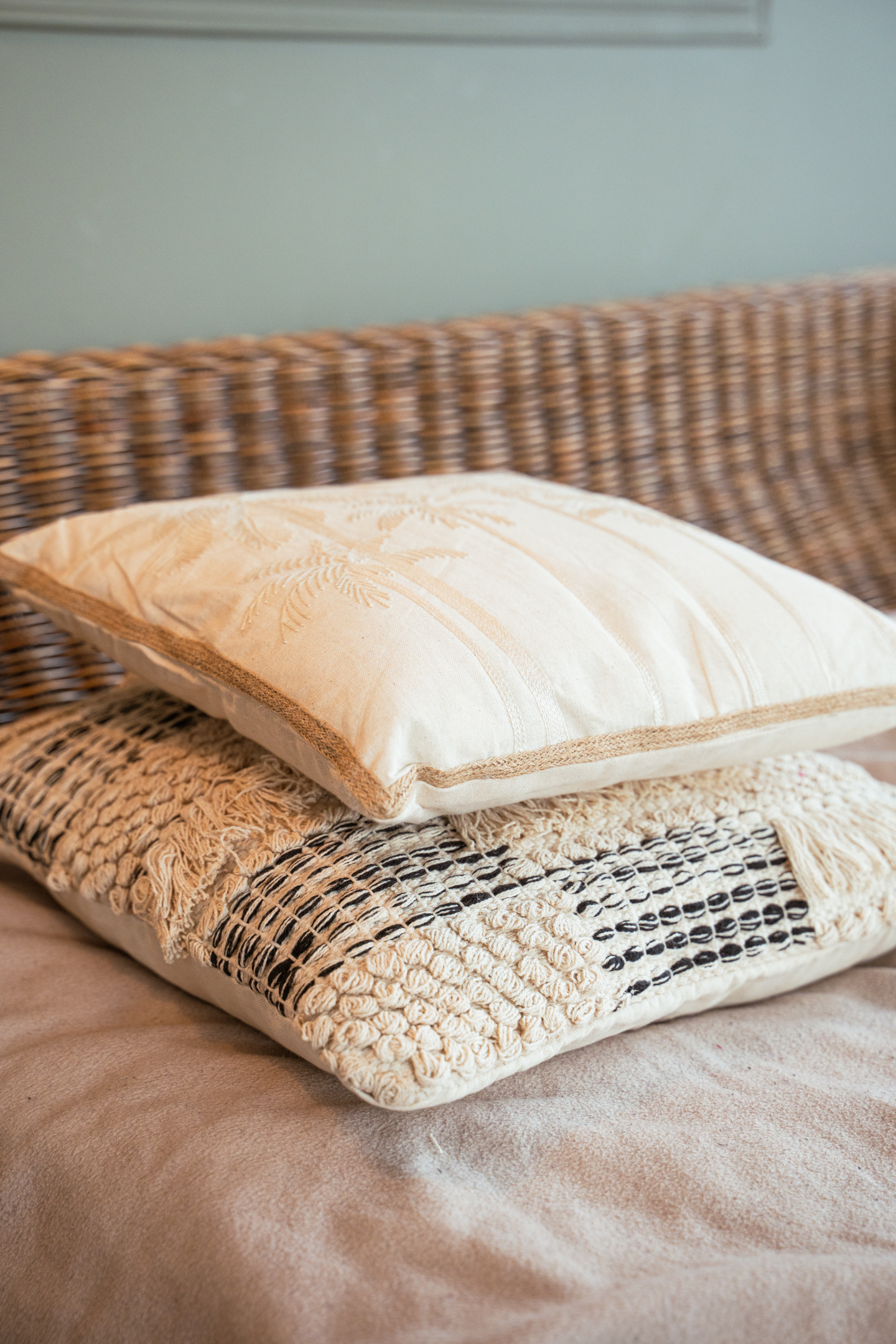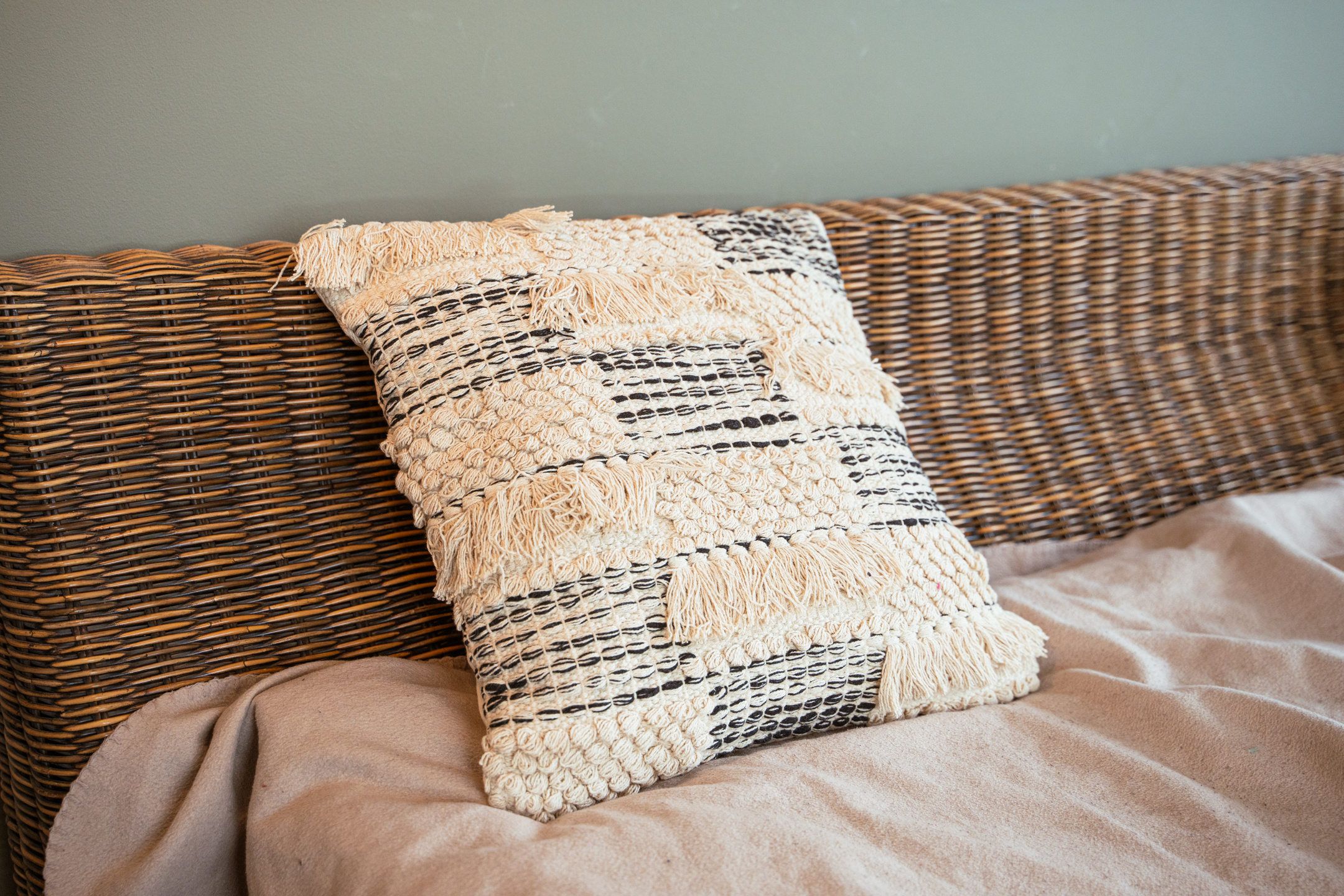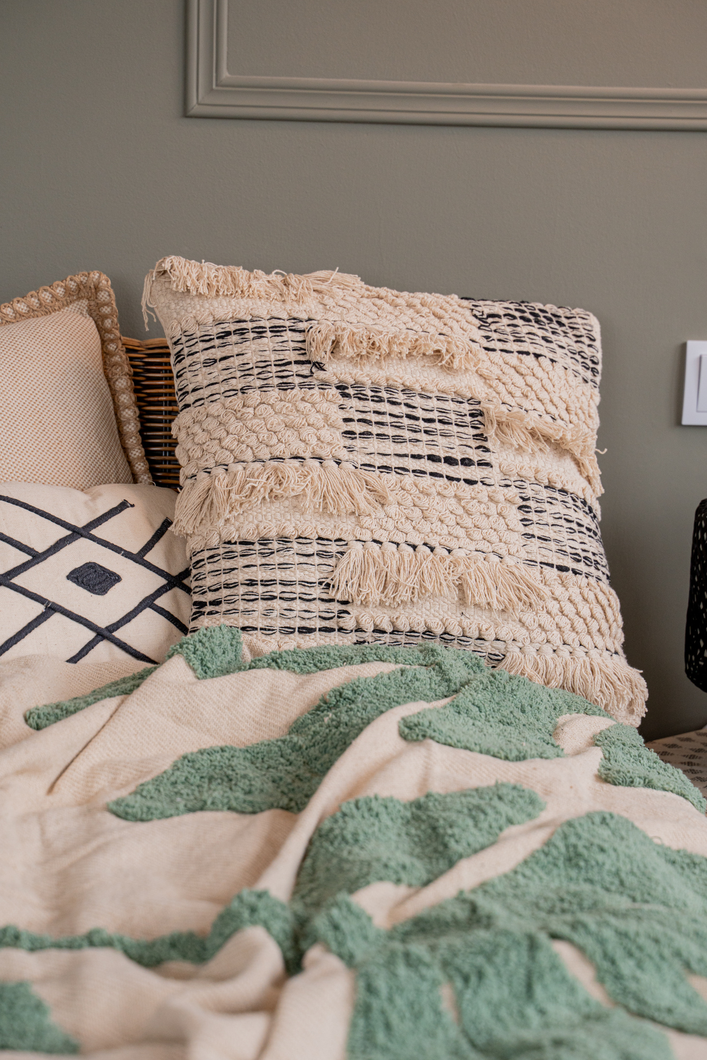 Perna decorativa cu ciucuri, fata de perna din bumbac, 45 x 45 cm. Fata de perna cu franjuri: Din bumbac, perna se remarca prin franjuri delicate care ii confera un caracter unic. Culoarea sa bej și modelele negre delicate adaugă eleganță și stil interiorului. Dimensiuni optime: Perna cu dimensiunea de 45 x 45 cm si inaltimea de 15 cm este ideala pentru decorarea sufrageriei sau dormitorului. Dimensiunea sa adecvată oferă suport confortabil și aspect estetic în interiorul dumneavoastră. Ușor de utilizat și întreținut: Fata de pernă este detașabilă și cu fermoar pentru o curățare ușoară și păstrare curată. Umplutura din poliester asigură moliciune și confort în timpul utilizării. Franjuri pentru un efect decorativ: Franjurii nu sunt doar un plus elegant, ci ofera si pernei un aspect unic. Ei creează un accent decorativ frumos în interiorul tău. Utilizare universală: Această pernă se potrivește perfect în diverse stiluri și aranjamente interioare, adăugându-le farmec și confort. Poate fi un accent decorativ pe o canapea, fotoliu sau pat, oferind camerei un caracter unic.
