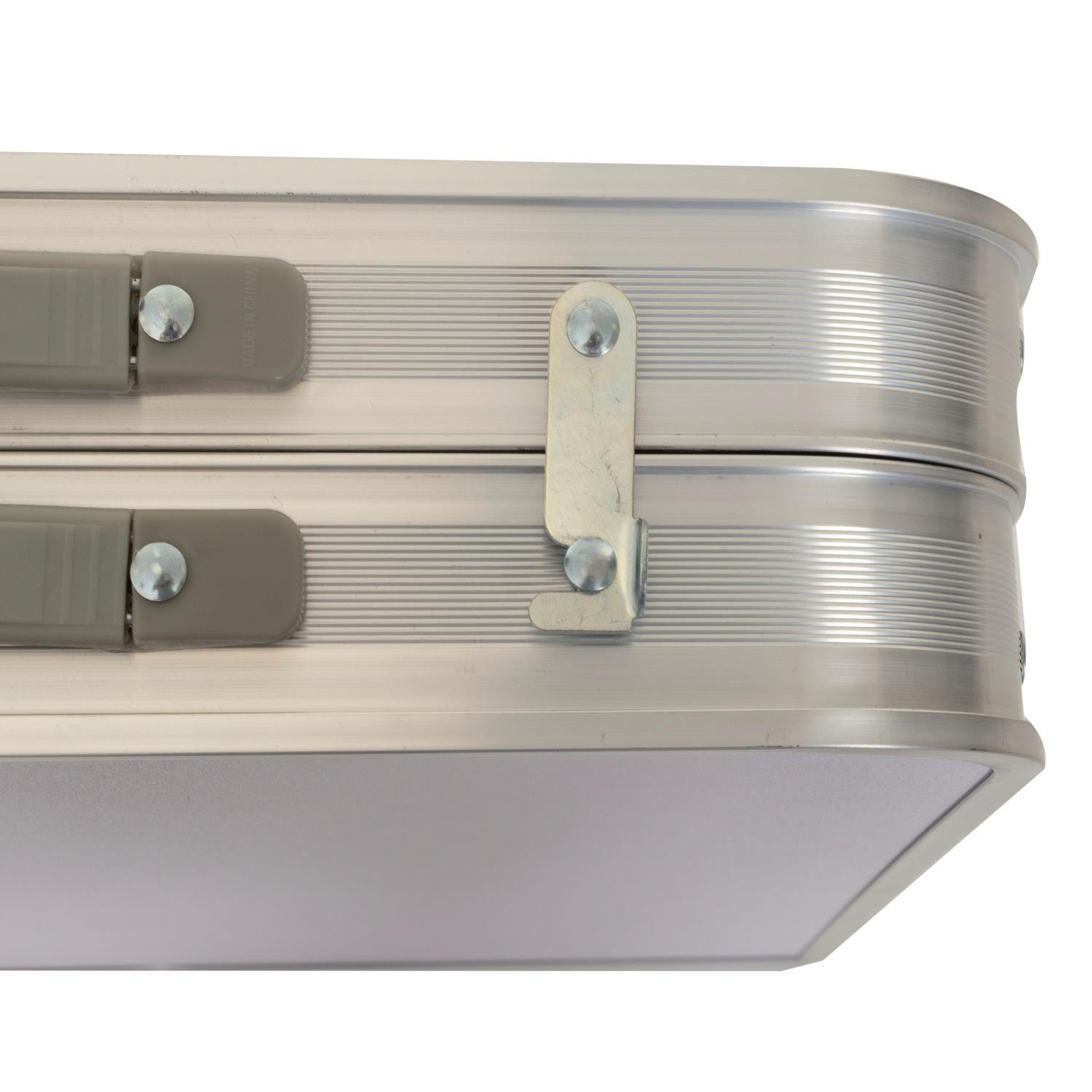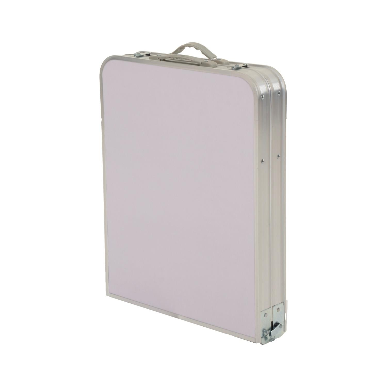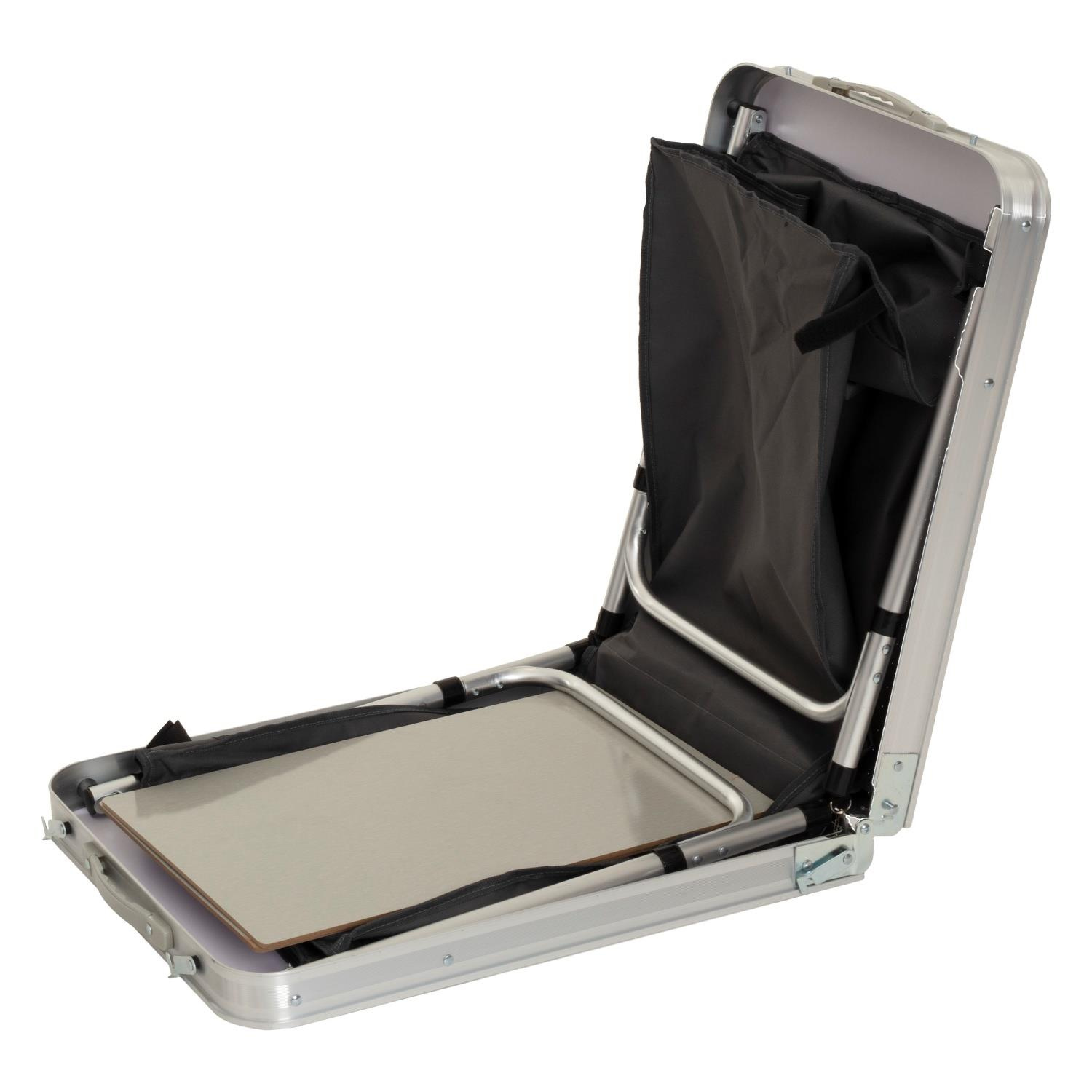 Masa plianta: Masa prezentata poate fi pliata plat, intr-o valiza mica. După pliere, ocupă atât de puțin spațiu încât o poți încadra în orice mașină. Mânerul o face ușor de transportat.