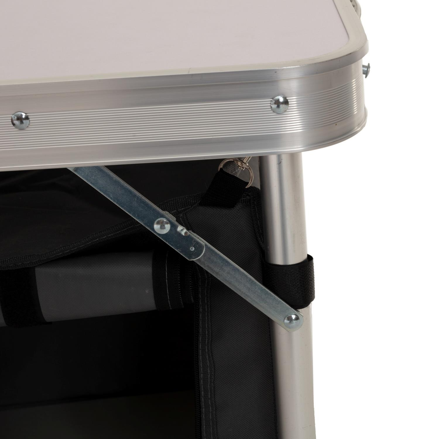 Masa de camping pliabila cu cutie de depozitare pentru accesorii.