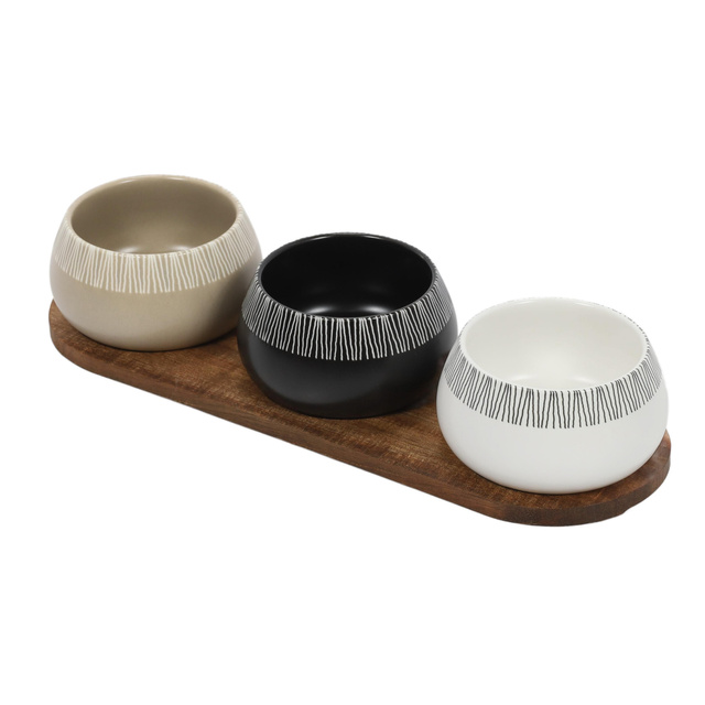 - Materiale de înaltă calitate: Bolurile sunt fabricate din ceramică, ceea ce le asigură durabilitatea și rezistența la deteriorare. Tava din lemn de acacia adaugă un farmec natural și este un complement excelent al întregului set.